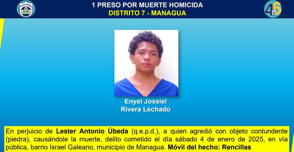 Se destaca el caso de Enyel Jossiel Rivera Lechado, quien el 4 de enero, en el barrio Israel Galeano del Distrito VII de Managua, motivado por rencillas personales mató con una piedra a Lester Antonio Úbeda.