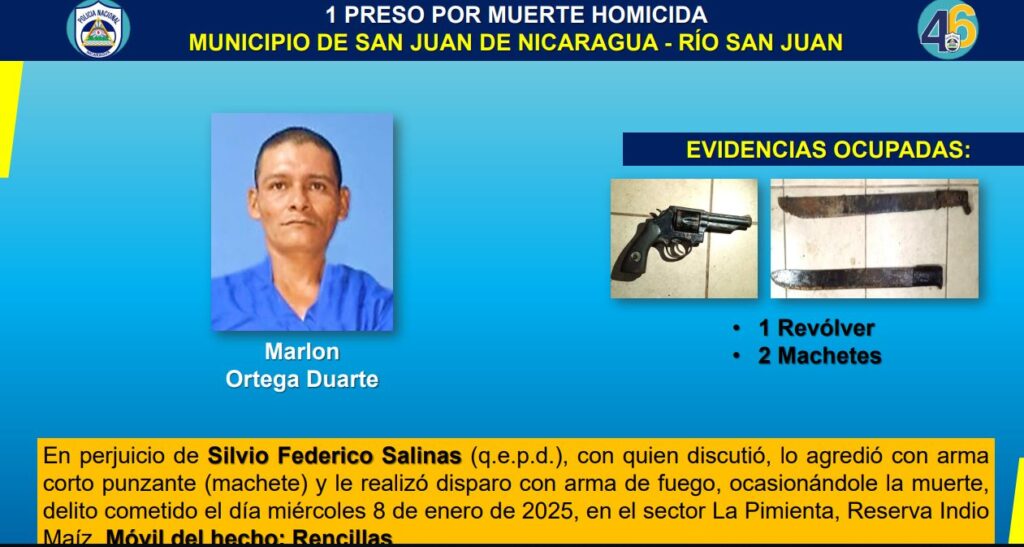 Mientras que en el municipio de Río San Juan, fue detenido Marlon Ortega Duarte, quien también por rencillas personales, privó de su existencia a Silvio Federico Salinas, a quien primero agredió con un machete y luego le asestó varios disparos. El crimen ocurrió el 8 de enero, en el sector La Pimienta, Reserva Indio Maíz.