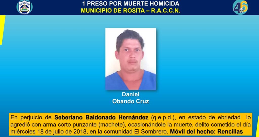 Asimismo, Daniel Obando Cruz, está preso luego que el 18 de julio del 2018, tomado de licor asesinó a machetazos a Seberiano Baldonado Hernández en la comunidad El Sombrero, municipio de Rosita en el Caribe Norte.