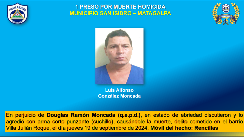 Por otra parte, Luis Alfonso González Moncada fue señalado de causar la muerte a Douglas Ramón Moncada. Los motivos aparentemente fueron rencillas. Los hechos sucedieron en San Isidro, municipio de Matagalpa.