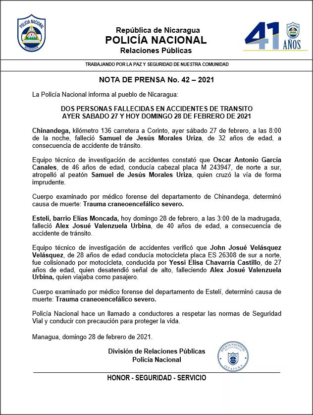 Chinandega, en el kilómetro 136 carretera a Corinto, (sábado 27 de febrero, a las 8:00 de la noche), falleció Samuel de Jesús Morales Uriza, de 32 años de edad, a consecuencia de accidente de tránsito.