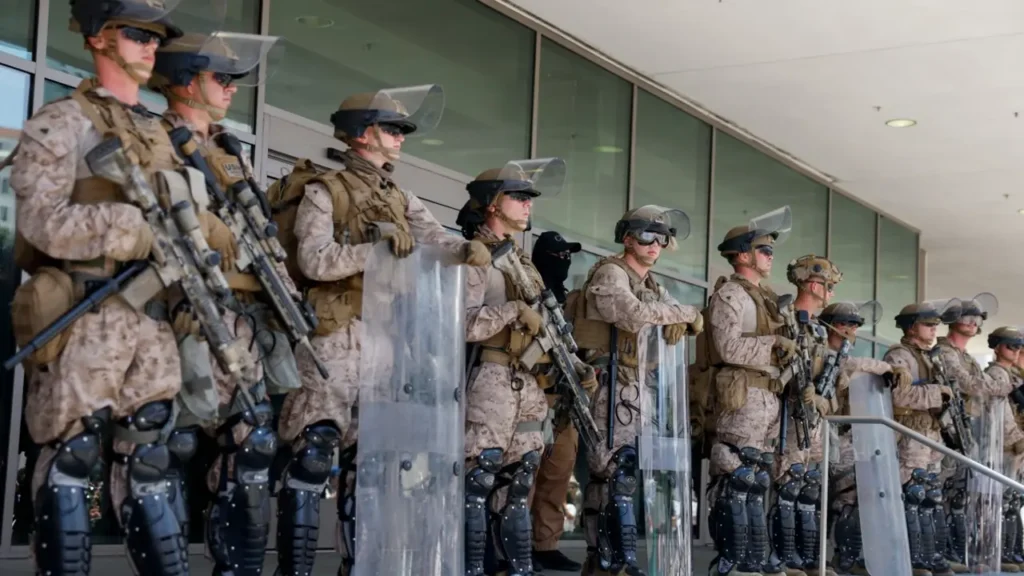 No obstante, la policía en Los Ángeles, en California, donde las protestas contra las redadas federales de inmigración surgieron una semana antes y causaron protestas a nivel nacional, empleó gas lacrimógeno y municiones de control de multitudes para dispersar a los detractores tras concluir el acto oficial.