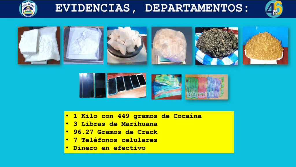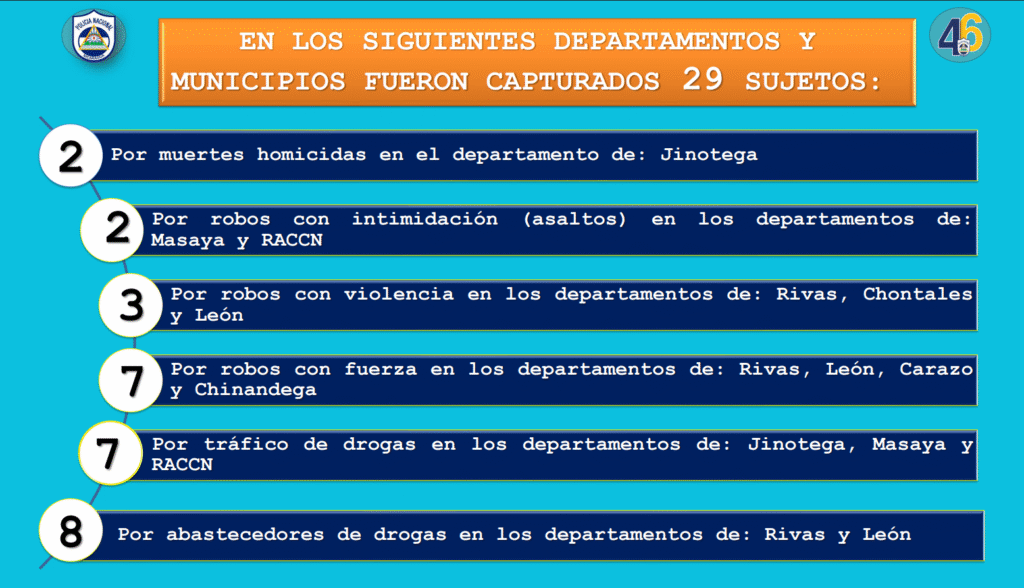 “La Policía Nacional logró la captura de 47 sujetos en distritos y municipios de Managua, uno por muerte homicida, 17 por robos con intimidación, siete por robos con violencia, 21 por robos con fuerza y un tráfico de droga. En los departamentos y municipios fueron capturados 29 sujetos. Dos por homicidios en el departamento de Jinotega, dos por robo con intimidación en los departamentos de Masaya y Región Autónoma de la Costa Caribe Norte. Tres por robos con violencia en los departamentos de Rivas, Chontales y León. Siete por robo con fuerza en los departamentos de Rivas, León, Carazo y Chinandega”, detalló este lunes la Cojefa de Relaciones Públicas de dicha institución, subcomisionada Karen Obando.