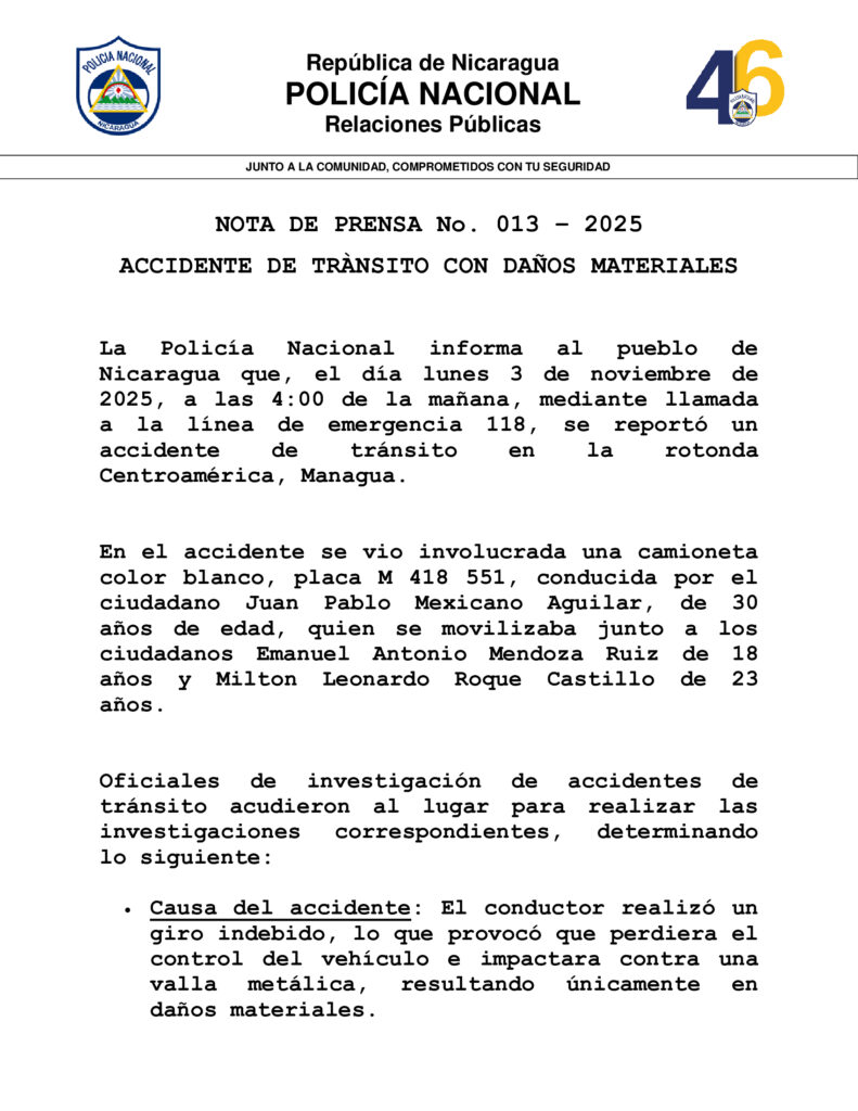 El creador de contenido, Juan Pablo Mexicano Aguilar de 30 años de edad, no iba en estado de ebriedad al momento de conducir su vehículo y chocar en la rotonda Centroamérica, Managua, la madrugada del lunes informó la Policía Nacional en un comunicado este miércoles.