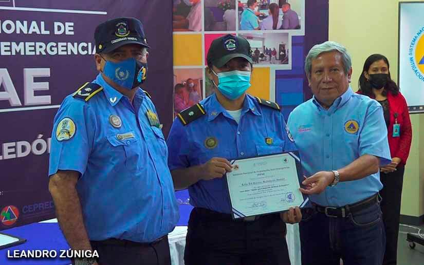 El Sistema Nacional para la Prevención, Mitigación y Atención de Desastres (Sinapred) entregó certificados a oficiales de la policía nacional como egresados del cuarto Curso Básico en la Gestión de Reducción de Riesgos de Fenómenos Naturales, impartidos en el Instituto Nacional de Preparación ante Emergencias (Inpae).