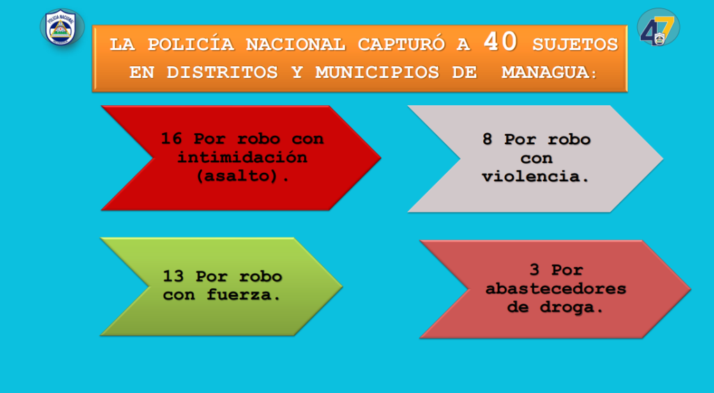 La Cojefa de Relaciones Públicas de la Policía Nacional, comisionada Karen Obando, detalló, que en Managua fueron capturados 16 por robo con intimidación, 13 por robo con fuerza, ocho por robo con violencia y tres por abastecimiento de drogas.
