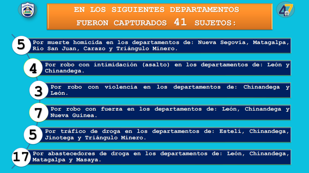 Además, de cinco por muerte homicida en Nueva Segovia, Matagalpa, Río San Juan, Carazo y Triángulo Minero, cuatro por robo con intimidación (asalto) en León y Chinandega y tres por robo con violencia en Chinandega y León, para un total de 41 detenidos.