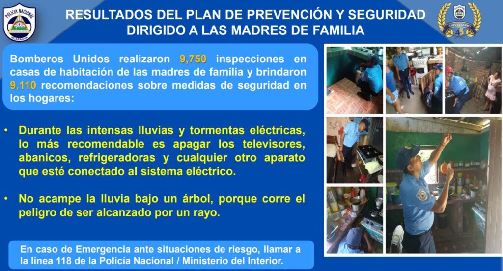 Así mismo, como parte del Plan de Prevención y Seguridad, dirigido a las madres de familia, en coordinación con los Bomberos Unidos, se efectuaron 9 mil 750 inspecciones en viviendas y se brindaron 9 mil 110 recomendaciones sobre medidas de seguridad.