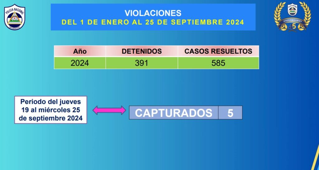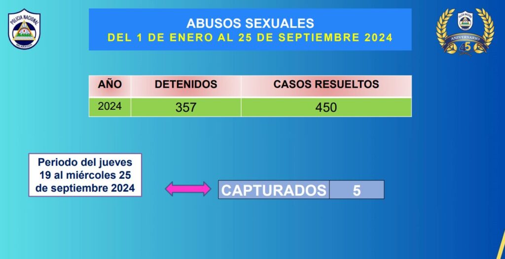 De igual forma, de 19 al 25 de septiembre se registraron cinco capturados por violación e igual número por abusos sexuales.