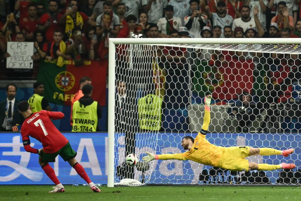 Portugal's forward #07 Cristiano Ronaldo scores a penalty shoot-out past Slovenia's goalkeeper #01 Jan Oblak during the UEFA Euro 2024 round of 16 football match between Portugal and Slovenia at the Frankfurt Arena in Frankfurt am Main on July 1, 2024. (Photo by Angelos Tzortzinis / AFP)