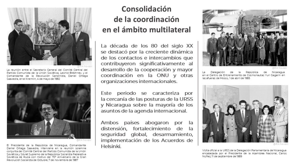 La exposición contiene además, archivos sobre el establecimiento de las relaciones, las visitas de líderes nicaragüenses a la Unión Soviética y de los acuerdos alcanzados, así como información sobre la cooperación.