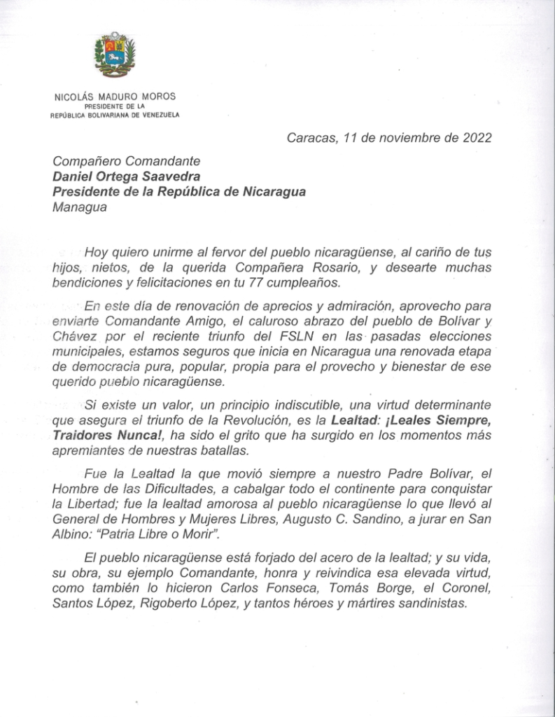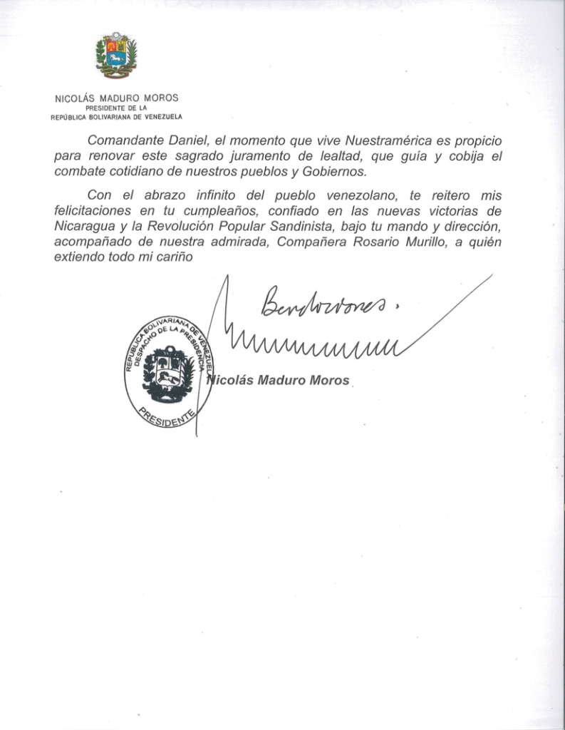 Mensaje del Presidente Nicolás Maduro Moros al Presidente Comandante Daniel Ortega
