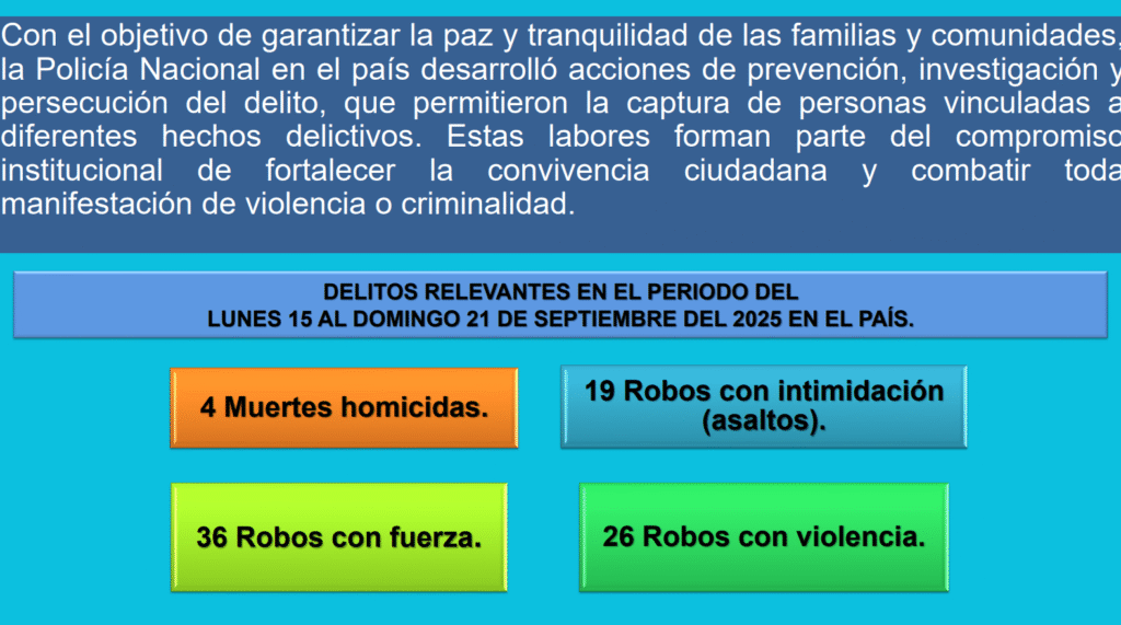 Sobresale además, que del 15 al 21 de septiembre, se reportaron en cuatro homicidios, 19 robos con intimidación, 36 robos con fuerza y 26 robos con violencia.