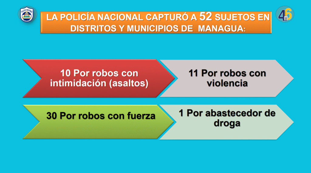 “La Policía Nacional capturó a 52 sujetos en distritos y municipios de Managua, 10 por robos con intimidación asalto, 11 por robos con violencia, 30 por robos con fuerza y uno por abastecedor de droga. En los departamentos fueron capturados 24 sujetos”, indicó el informe semanal de las Fuerzas Policiales.