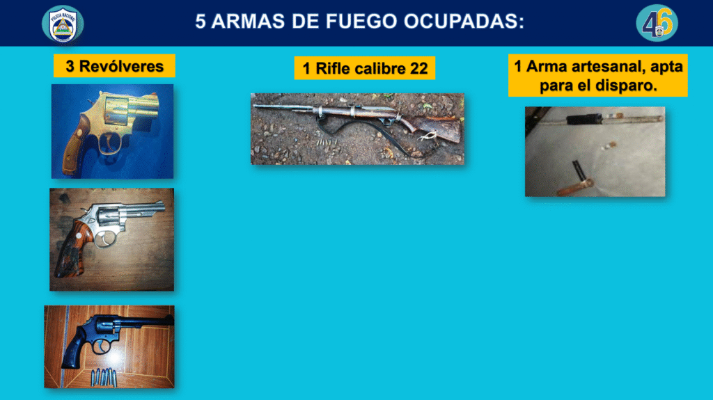 Entre las evidencias incautadas están: un kilo con 97 gramos de cocaína, 159.1 gramos de piedras de crack, dos teléfonos celulares, dinero en efectivo, tres revólveres, un rifle calibre 22 y un arma artesanal acta para el disparo.