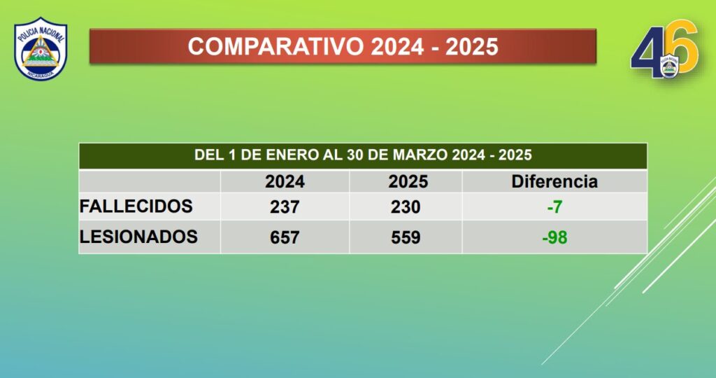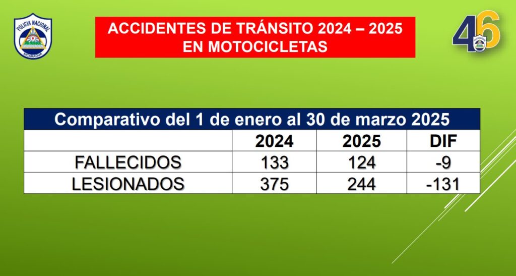 “En el comparativo 2024-2025 del primero de enero al 30 de marzo del 2024-2025, en fallecidos estamos en menos siete, en lesionados menos 98. En accidentes de tránsito donde están involucradas las motocicletas del 2024 al 2025, en fallecidos estamos en menos nueve y en lesionados en menos 13”, expuso la Cojefa de Relaciones Públicas de la institución del orden público, subcomisionada Karen Obando.