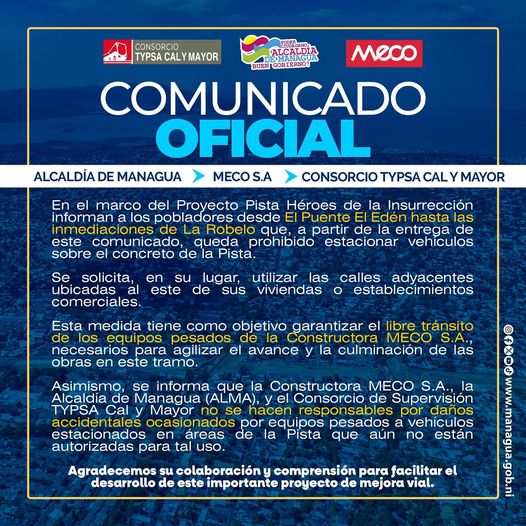 “Asimismo, se informa que la Constructora Meco S.A., la Alcaldía de Managua y el Consorcio de Supervisión Typsa Cal y Mayor; no se hacen responsables por daños accidentales ocasionados por equipos pesados a vehículos estacionados en áreas de la pista que aún no están autorizadas para tal uso”, indica la comunicación.