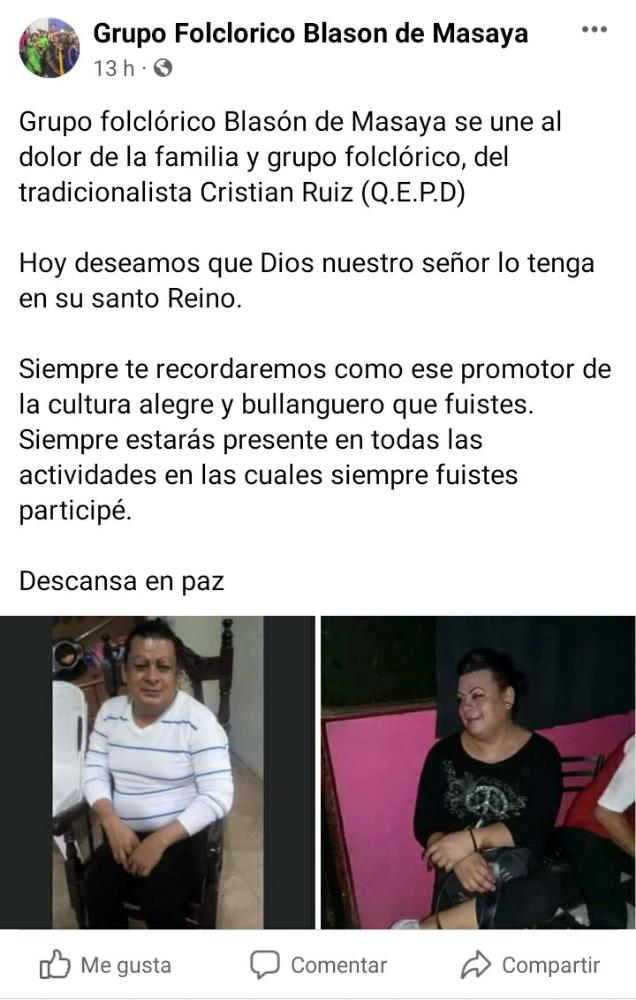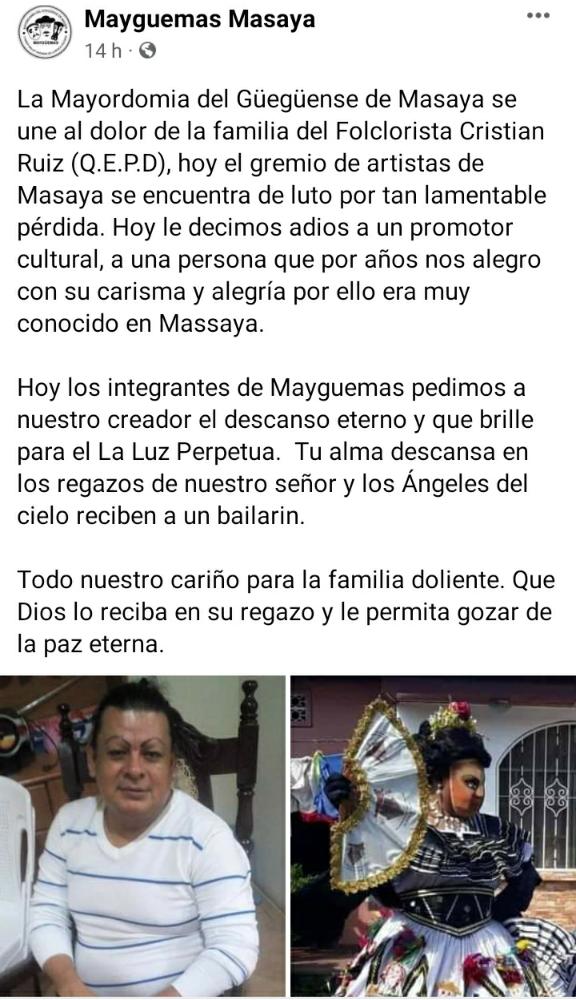 La Mayordomia del Güegüense de Masaya, publico en su cuenta de Facebook, “Hoy los integrantes de Mayguemas pedimos a nuestro creador el descanso eterno y que brille para el la luz perpetua. Tu alma descansa en los regazos de nuestro señor y los ángeles del cielo reciben a un bailarín”.