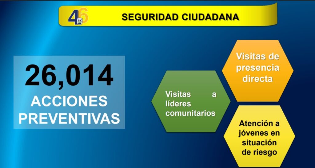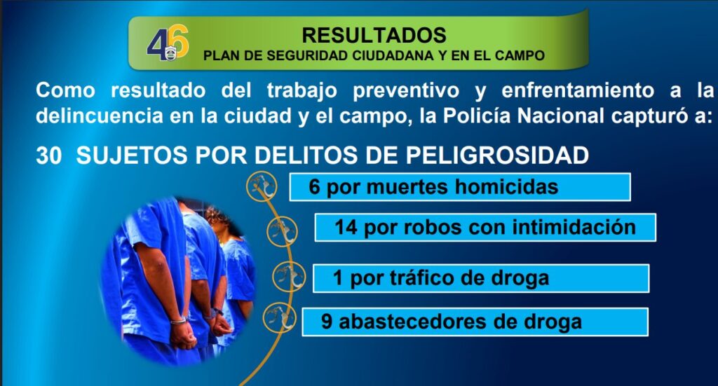 “La Policía Nacional capturó a 30 sujetos por delitos de peligrosidad, seis por homicidio, 14 por robo con intimidación, uno por tráfico de droga y nueve abastecedores de droga. Dentro de las evidencias ocupadas, tenemos tres armas de fuego, 132.8 libras de marihuana, 3.5 gramos de crack, 22.90 gramos de cocaína y tres motocicletas”, detalló la Cojefa de Relaciones Públicas de la institución del orden público, subcomisionada Karen Obando.