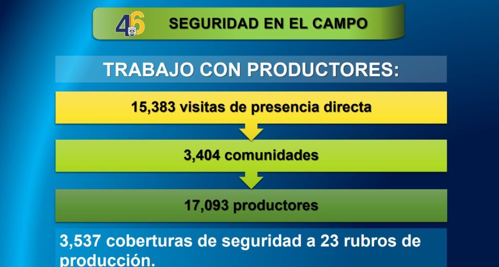 Asimismo, se garantizó presencia directa en 3 mil 404 comunidades con 17 mil 93 productores, realizando 3 mil 537 coberturas de seguridad a 23 rubros de la producción y el resguardo del traslado de la Merienda Escolar.