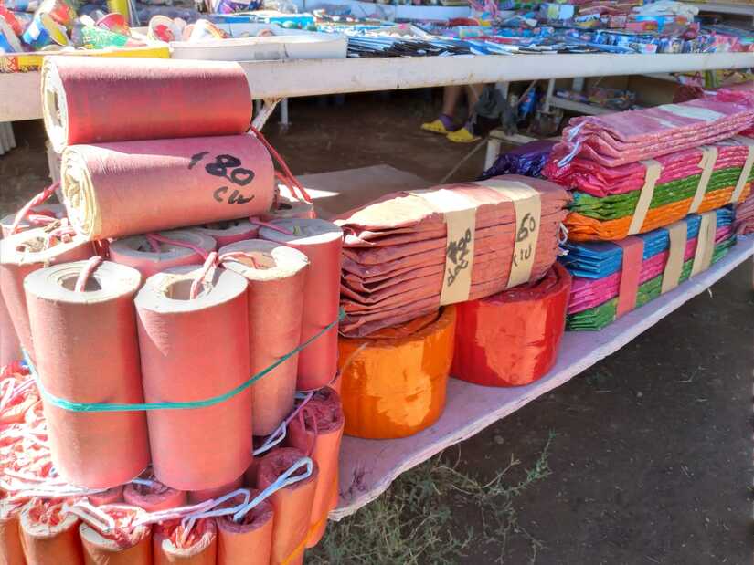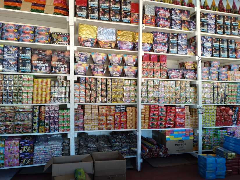 Los dos puestos de venta suman más de 15 tramos que ofertan pólvora y cuentan con las medidas de seguridad para protección de ofertantes y visitantes, como rótulos de no fumar, extintores, barriles con agua, separación entre los tramos y otros.