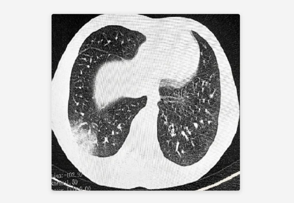 La enfermedad se revela examinando los pulmones, que emiten un sonido parecido al crujido que hacen las palomitas de maíz cuando estallan. En casos graves, los pacientes son ingresados ​​en unidades de cuidados intensivos y requieren ventilación mecánica.
