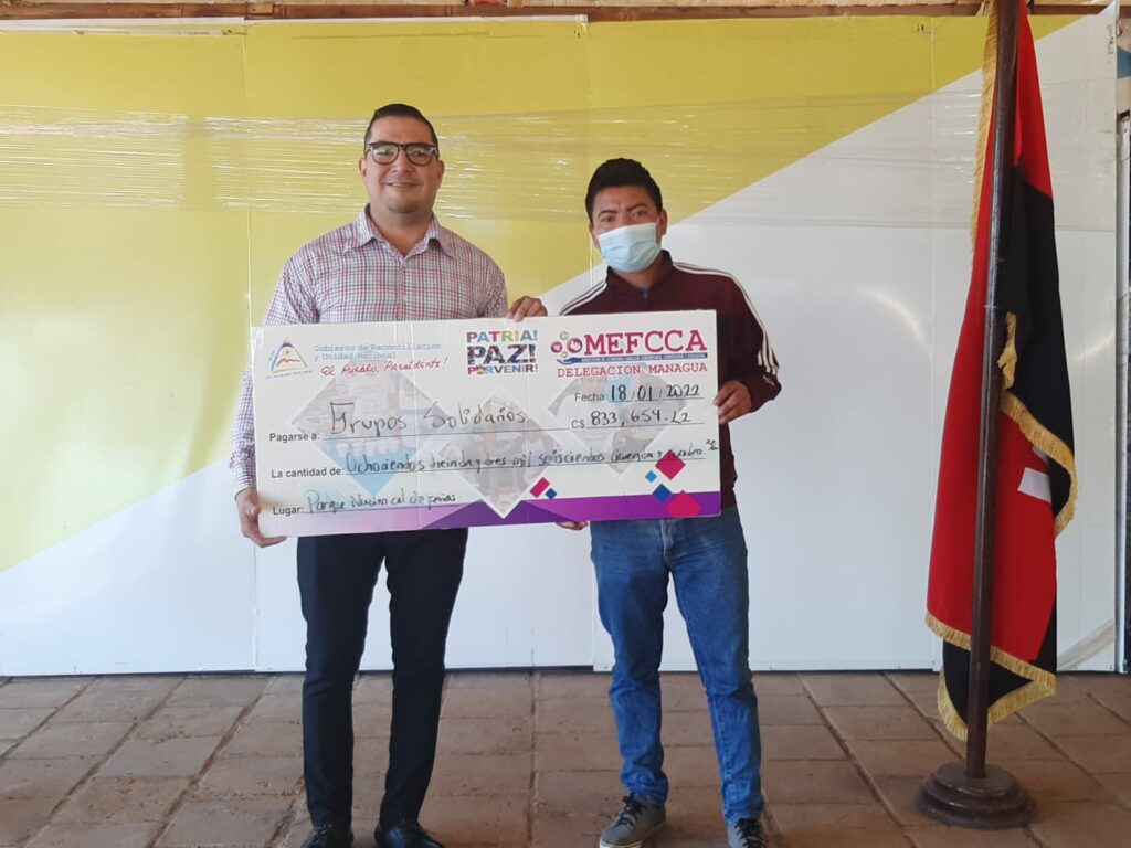 En saludo a la Jornada Dariana 2022, celebrando el 155 aniversario del natalicio del Poeta Universal Rubén Darío, el Ministerio de Economía Familiar y Comunitaria Cooperativa y Asociativa (MEFCCA), realizó un desembolso de 833 mil 654 córdobas a un grupo de 38 productores de Ciudad Sandino, El Crucero y Mateare, del distrito I de Managua.