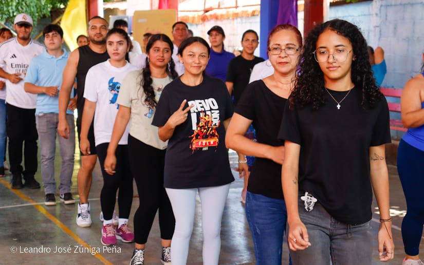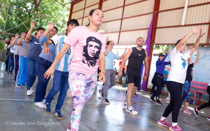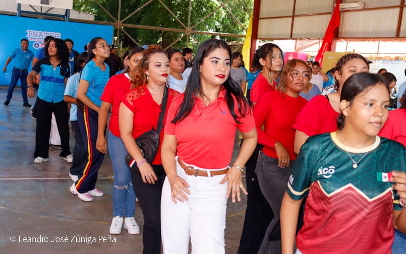 Estudiantes de las carreras técnicas y docentes de Managua fueron protagonistas este miércoles, del mega zumbatón Bailando por la Paz, realizado en el centro Manuel Olivares en homenaje previo al 46 aniversario del triunfo de la Revolución Popular Sandinista.