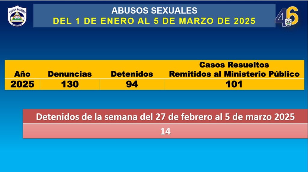 En la semana del 27 de febrero al 5 de marzo fueron detenidos 15 sujetos señalados por el delito de violación en Nicaragua, informó este jueves, la Cojefa de Relaciones Públicas de la Policía Nacional, subcomisionada Karen Obando.