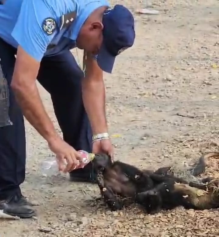 En varios vídeos que circulan en redes sociales se aprecia como autoridades municipales, bomberos y de la policía, les dan agua con una botella a los monos que están tirados en el suelo, casi agonizando, mientras otros caen desde los árboles moribundos y otros yacen ya muertos.
