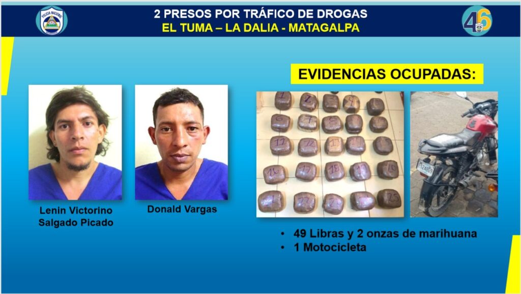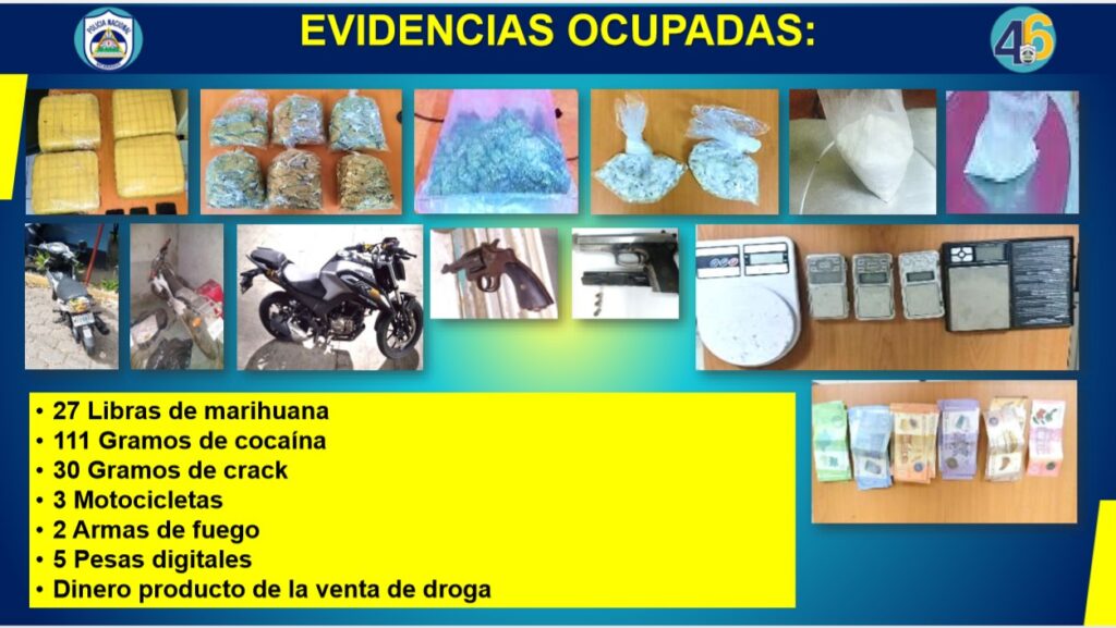 Señaló, que en Managua fueron detenidos nueve sujetos por tráfico de droga, incautándoles también, 11 gramos de cocaína, 30 de crack, tres motocicletas, cinco pesas digitales, dos armas de fuego y dinero en efectivo producto de la venta de estupefacientes.