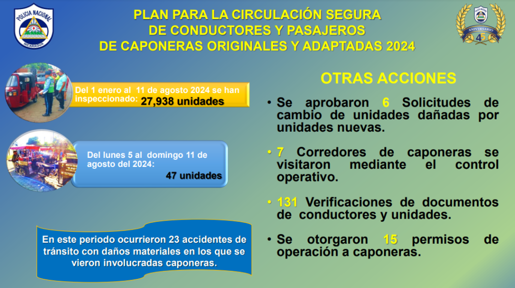 Del 1 de enero al 11 agosto de 2024 se han inspeccionado 27 mil 938 caponeras. En la última semana se han examinaron 47 unidades, así como otras acciones con respecto a los corredores de ese tipo de vehículos de transporte de pasajeros.