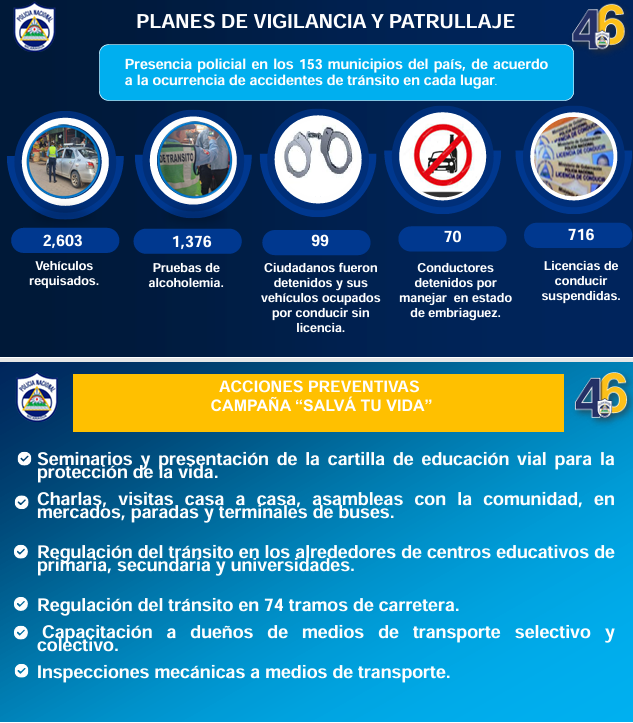 Añadió, que dentro de los planes de vigilancia patrullada de la Policía Nacional, tuvo presencia policial en los 153 municipios y que continuaron implementando acciones preventivas dentro de la campaña permanente Salvá tu Vida.