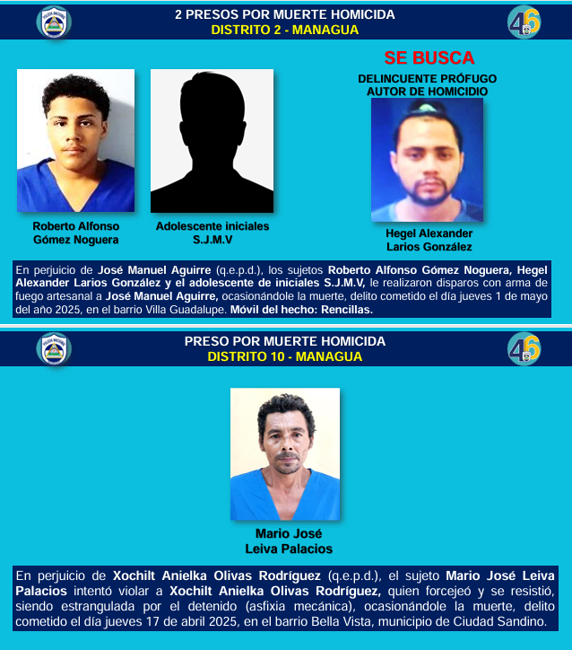 Detalló, que en el Distrito II de Managua fueron arrestados por muerte homicida, Roberto Alfonso Gómez Noguera y el adolescente de iniciales SJMB, en perjuicio de José Manuel Aguirre. Indicó, que Gómez Noguera, Ángel Alexander Larios González, este último, prófugo de la justicia y el adolescente SJMB, le dispararon Aguirre con arma de fuego artesanal, ocasionándole la muerte. El hecho ocurrió 1 de mayo en el barrio Villa Guadalupe, siendo el móvil por rencillas.