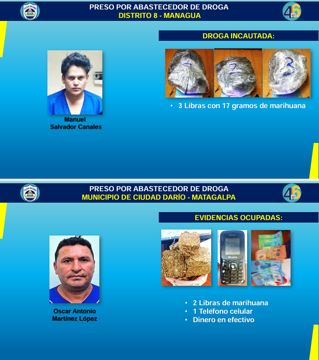 En tanto, por abastecimiento de droga fueron capturados en el Distrito VIII de Managua, Manuel Salvador Canales, incautándole 3 libras con 17 gramos de marihuana. En el municipio de Ciudad Darío, Matagalpa, a Oscar Antonio Martínez López, a quien le ocuparon 2 libras de marihuana, un teléfono celular y dinero en efectivo. En el municipio de Pueblo Nuevo, Jinotega, fue detenido Tito Uriel Torres Centeno con una libra de marihuana, 29.2 gramos de crack, una motocicleta y un teléfono celular y en Bluefields, Región Autónoma de la Costa Caribe Sur, capturaron a Michael Anthony Zambrana Miles, incautándole 220.9 gramos de marihuana.