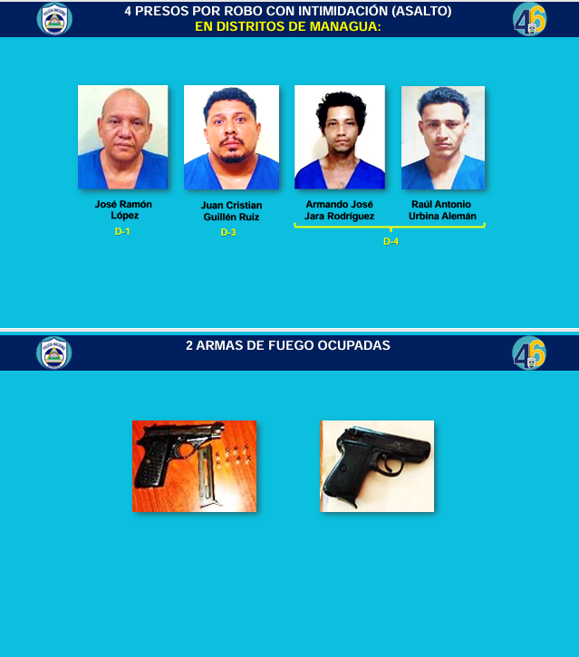 Obando, añadió que también resultaron detenidos cuatro delincuentes por robo con intimidación (asalto) en los distritos de Managua, siendo estos: José Ramón López, Juan Cristian Guillén Ruiz, Armando José Jara Rodríguez y Raúl Antonio Urbina Alemán, ocupando como evidencias dos armas de fuego.