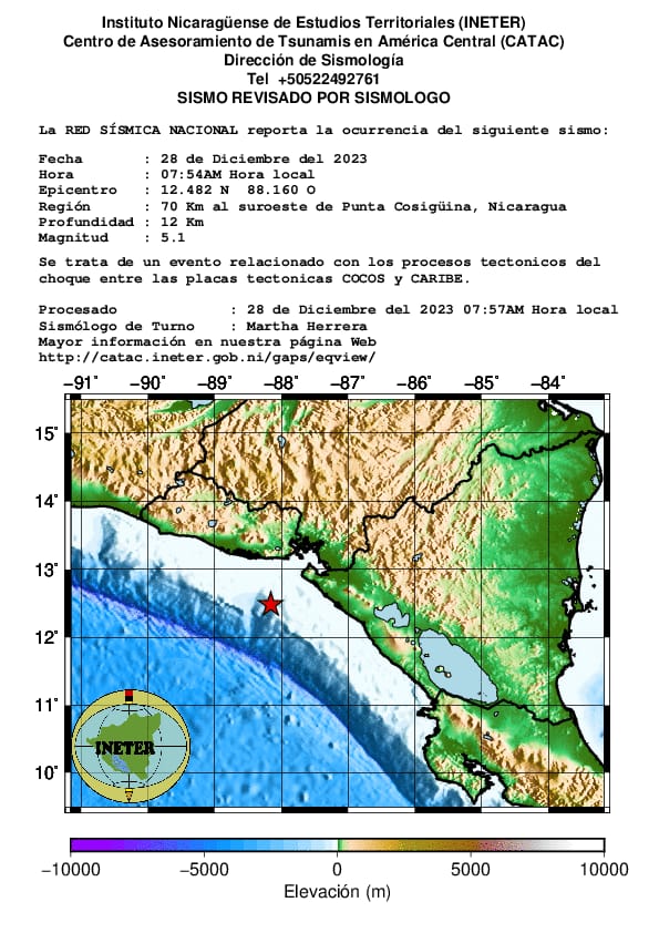La Red Sísmica Nacional reportó este jueves por la mañana, un sismo de magnitud 5.1, a 70 km al suroeste de Punta Cosigüina, Nicaragua.