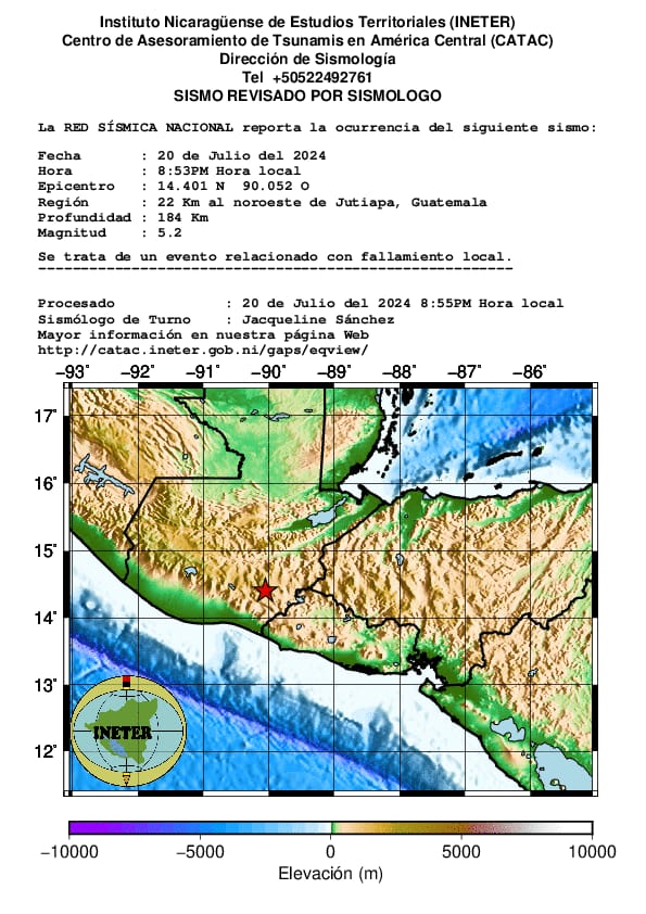De acuerdo con el Instituto Nicaragüense de Estudios Territoriales, el movimiento telúrico se reportó a una profundidad de 184 km, a 22 km noroeste de Jutiapa, Guatemala, y está relacionado a un evento de falla local.