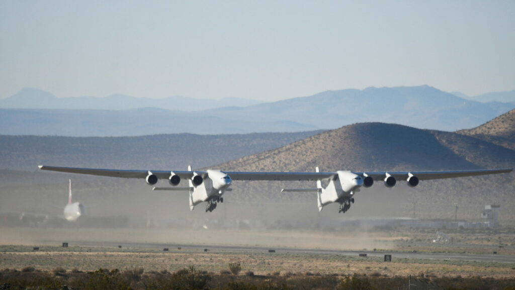 El ‘Roc’ despegó aproximadamente a las 10:30 de la mañana hasta alcanzar una altura de poco más de tres kilómetros sobre el desierto de Mojave, en California (EE.UU.). En las imágenes difundidas por la empresa se puede ver a la gigantesca aeronave aterrizar en el aeródromo tras un vuelo de tres horas y 14 minutos.