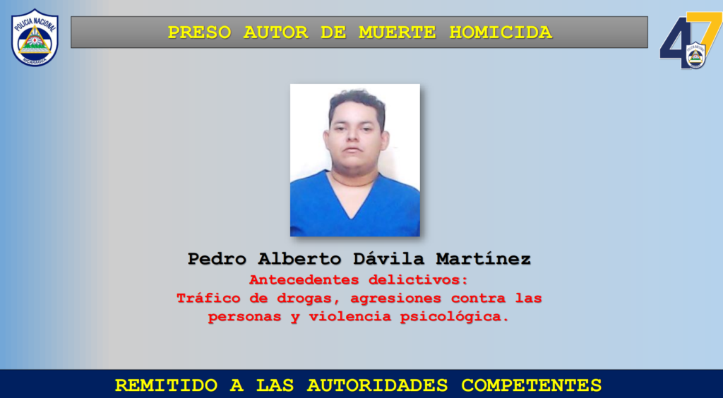 Este martes la Policía Nacional, informó la captura de Pedro Alberto Dávila Martínez de 28 años, quien por rencillas, mató a balazos al adolescente de iniciales A.D.T.L.; este sujeto tiene un rosario de antecedentes delictivos por tráfico de drogas, agresiones contra las personas y violencia psicológica.