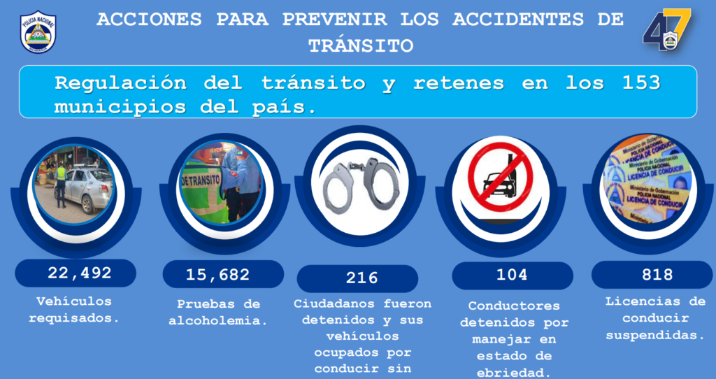 “Se garantizó regulación del tránsito y retenes en los 153 municipios del país. Como resultado, 22 mil 492 vehículos fueron requisados, 15 mil 682 pruebas de alcoholemia realizadas, 216 ciudadanos fueron detenidos y sus vehículos ocupados por conducir sin licencia. 104 conductores detenidos por manejar en estado de ebriedad y 818 licencias de conducir fueron suspendidas”, detalló este martes la Cojefa de Relaciones Públicas de la Policía Nacional, comisionada Karen Obando.
