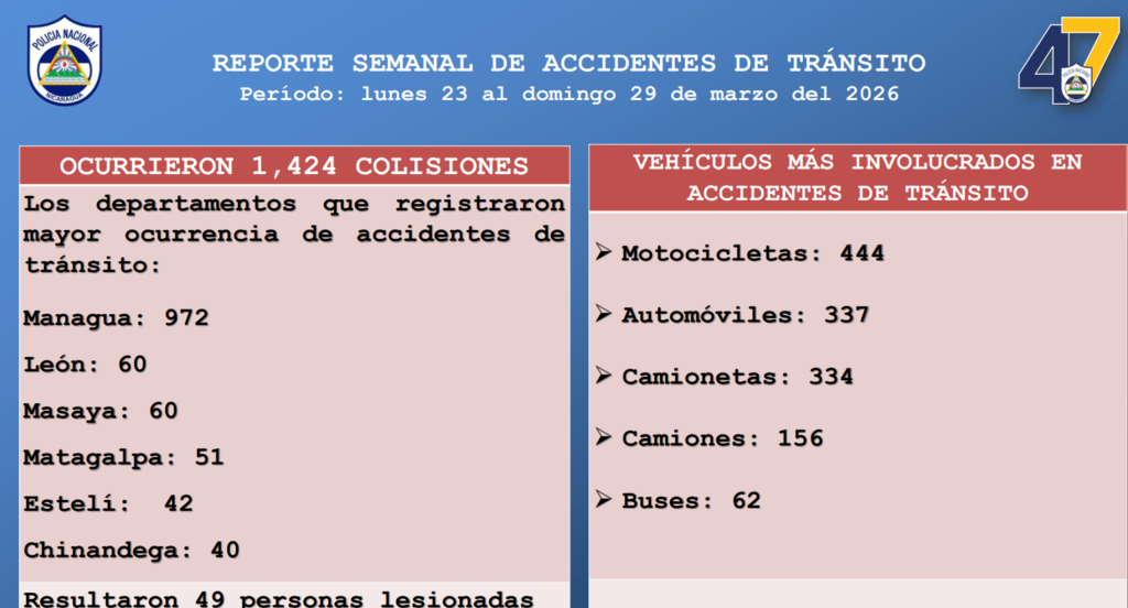 El informe detalló además, que del 23 al 29 de marzo, se registraron mil 424 accidentes de tránsito, siendo Managua el departamento que más colisiones registró con 972, le siguen León y Masaya con 60; Estelí con 42 y Chinandega con 40 accidentes de tránsito.