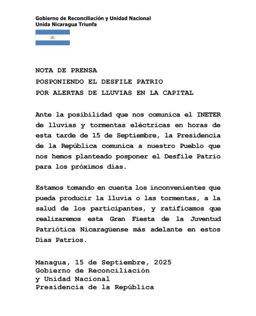 Ante la posibilidad de tormentas con lluvias eléctricas el desfile patrio fue suspendido este lunes en Nicaragua.