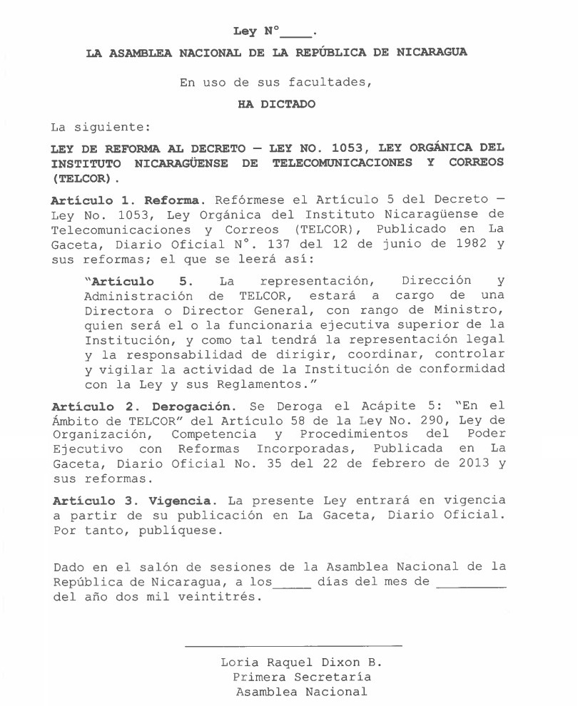 Una vez aprobada la Reforma, el Artículo 5 del Decreto Ley No. 1053, Ley Orgánica de TELCOR, se leerá así: “La representación, Dirección y Administración de TELCOR, estará a cargo de una Directora o Director General, con rango de Ministro, quien será el o la funcionaria ejecutiva superior de la Institución, y como tal tendrá la representación legal y la responsabilidad de dirigir, coordinar, controlar y vigilar la actividad de la Institución de conformidad con la Ley y sus Reglamentos.”