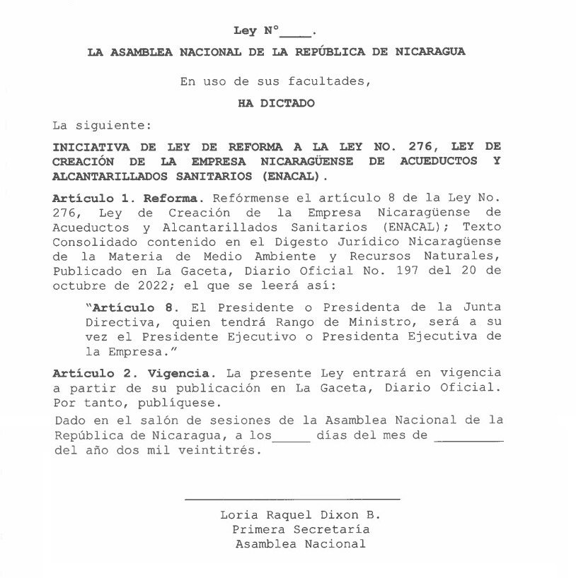 A rango de ministros serán elevados los titulares de la Empresa Nicaragüense de Acueductos y Alcantarillos (ENACAL) y del Instituto Nicaragüense de Telecomunicaciones y Correos (TELCOR), así se consigna en las dos iniciativas de ley que fueron presentada este viernes ante la Asamblea Nacional.