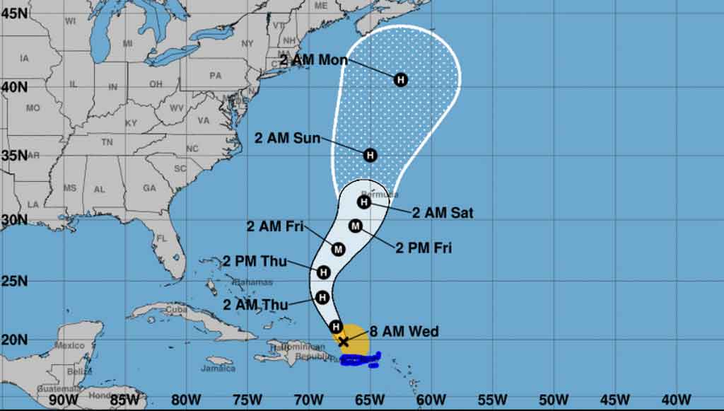 La quinta tormenta de la actual temporada ciclónica está ubicada cerca de la latitud 19.8 Norte, longitud 67.2 Oeste, se mueve a 26 kilómetros por hora y hará un giro hacia el norte-noroeste.