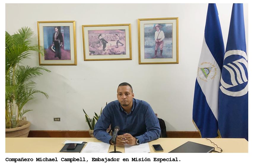 La Delegación del Gobierno de Reconciliación y Unidad Nacional de la República de Nicaragua estuvo integrada por el Compañero Amaru Ramírez, Viceministro de Transporte e Infraestructura, MTI, y el Compañero Michael René Campbell Hooker, Embajador en Misión Especial.