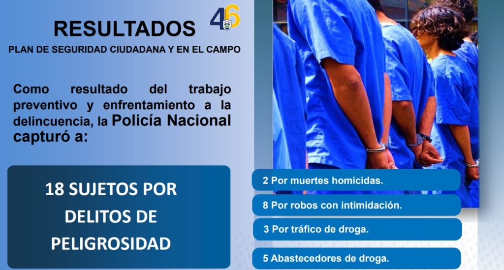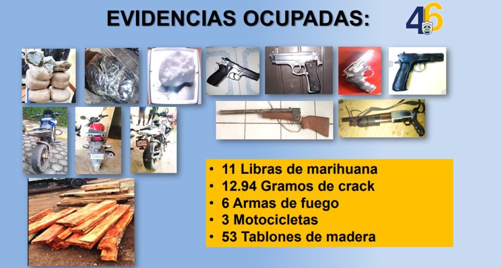 “Como resultado del trabajo preventivo y enfrentamiento a la delincuencia, la Policía Nacional capturó a 18 sujetos por delitos de peligrosidad. Evidencias ocupadas, 11 libras de marihuana, 12.94 gramos de crack, seis armas de fuego, tres motocicletas y 53 tablones de madera”, detalló la Cojefa de Relaciones Públicas de dicha institución, subcomisionada Karen Obando.