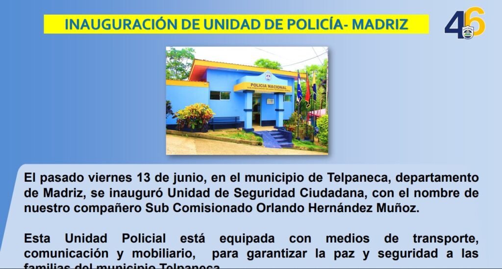 “Durante este plan también se inauguró Unidad de Seguridad Ciudadana con el nombre de nuestro compañero subcomisionado Orlando Hernández Muñoz. Esta unidad policial está equipada con medios de transporte, comunicación, inmobiliario para garantizar la paz y la tranquilidad y seguridad a las familias del municipio de Telpaneca”, indicó.