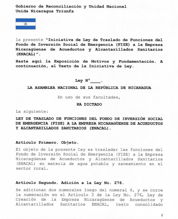 A continuación la Iniciativa de Ley de Traslado de Funciones del Fondo de Inversión Social de Emergencia a la Empresa Nicaragüense de Acueductos y Alcantarillados Sanitarios: